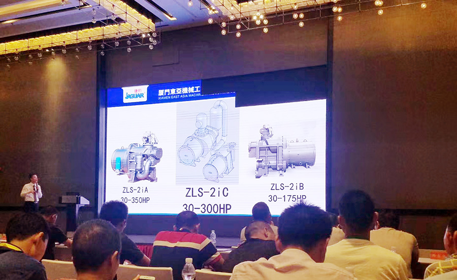 緊接著東亞機械總經理韓文浩先生上臺,對公司上半年的內部工作進行了報告,接著分享了全新產品ZLS-2iC和ZLS-2iB以及全新的AS系列的詳細技術參數。韓文浩先生用簡單的方式,深入簡出的介紹了二級壓縮產品的發展歷程,同時介紹了全新產品的產品特性,及同比目前市場銷售產品的優點。在場嘉賓在會后的討論時間對于所談內容進行了熱烈討論,大家對新產品反響熱烈。